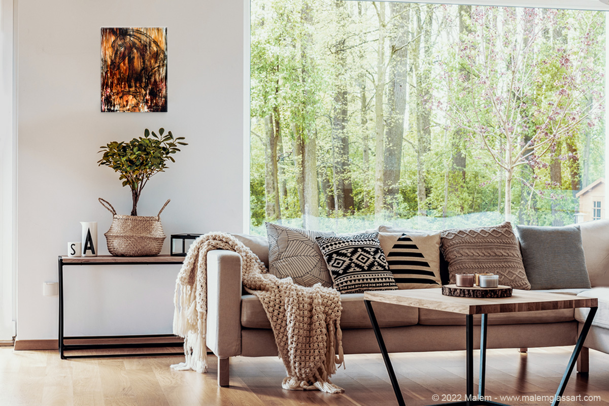 Glass transparence makes this piece change a lot depending on light conditions. Backlit like in daytime hung in a window, it reflects the battleground, the bloods, the war, the drama, the action. At night bottom scratches are whiter and stand out more, representing the scars bared by warriors, the nightmares, the trauma. This reproduction shows the daytime backlit version