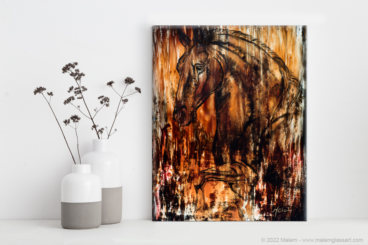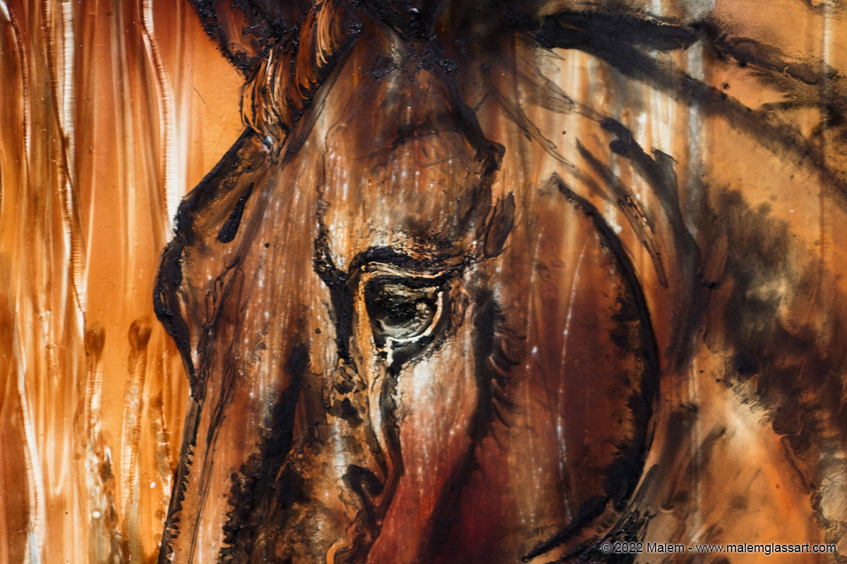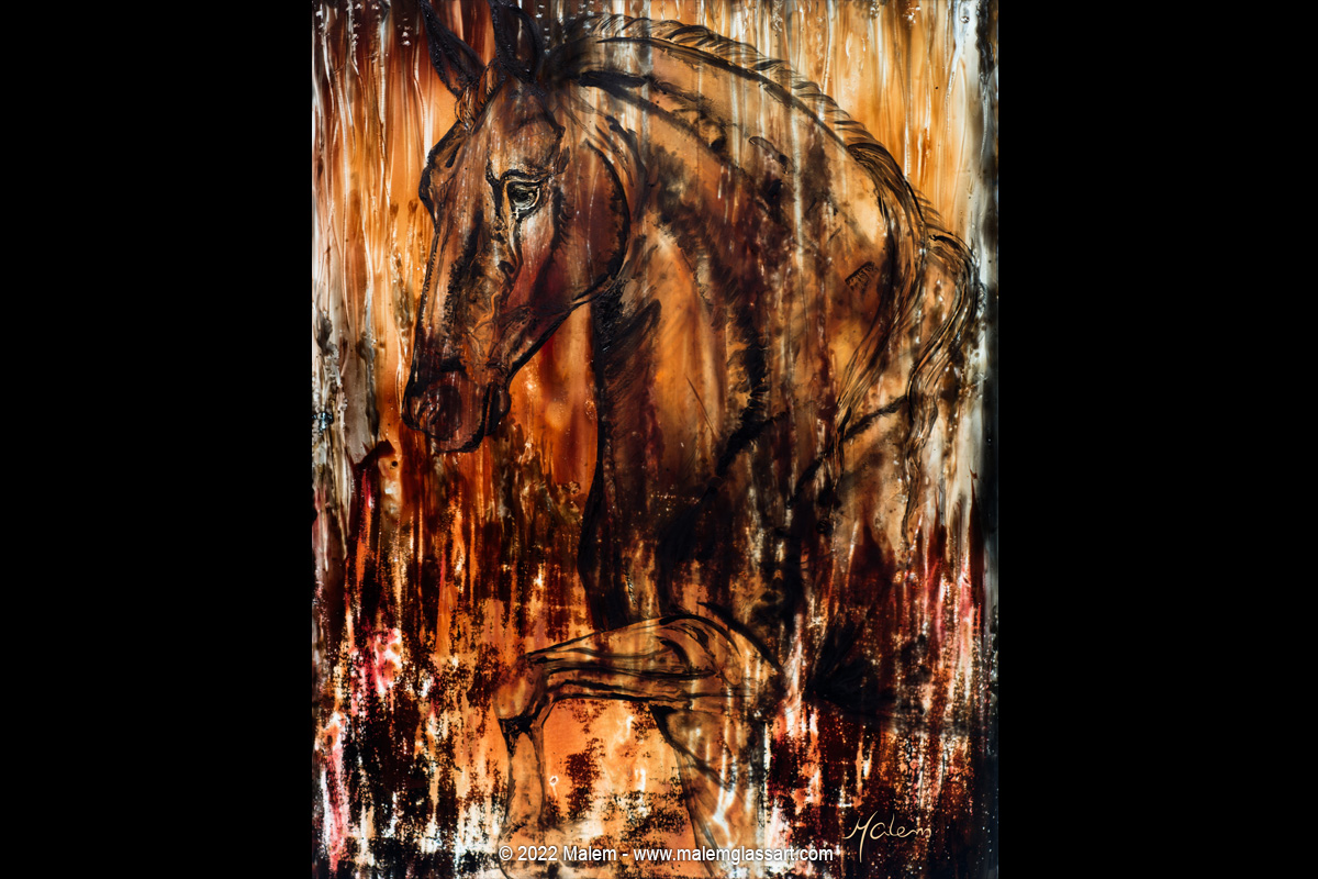 Glass transparence makes this piece change a lot depending on light conditions. Backlit like in daytime hung in a window, it reflects the battleground, the bloods, the war, the drama, the action. At night bottom scratches are whiter and stand out more, representing the scars bared by warriors, the nightmares, the trauma. This reproduction shows the daytime backlit version
